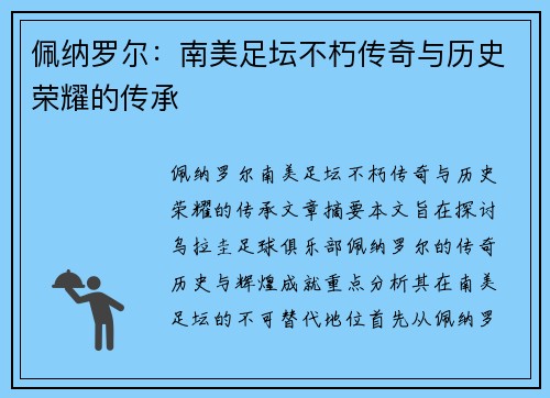 佩纳罗尔:南美足坛不朽传奇与历史荣耀的传承